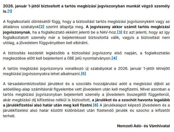 Rövid tájékoztató jelent meg a NAV honlapján a tartós megbízási jogviszonnyal foglalkoztatottak társadalombiztosítási szabályaival kapcsolatosan.